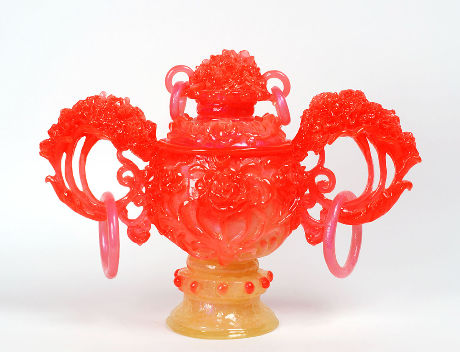 The artist's work is equal parts reaction to a minimalist childhood environment, and a celebration of the availability of imagery and color in the modern world. Visually evoking the abundance of digital pastiche that saturates commerce and urban life, the work is rendered in synthetic resin after being meticulously hand sculpted in clay, then cast in complex, multi-part molds. |
