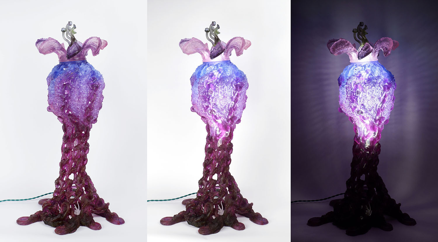 At the heart of Carol’s work is a beautiful illusion; ropes of lead crystal that appear to have been knitted. In fact, the artist’s process does rely on knitting, but in flexible wax rope that, through the magic of lost wax casting, is transformed in to lush, glowing ribbons of translucent color. Carol builds complex structures from lines of colored glowing glass. Serious as it sounds, her work typically takes anthropomorphic and playful shapes. This tension between technique and form produces a dynamic and enchanting result.