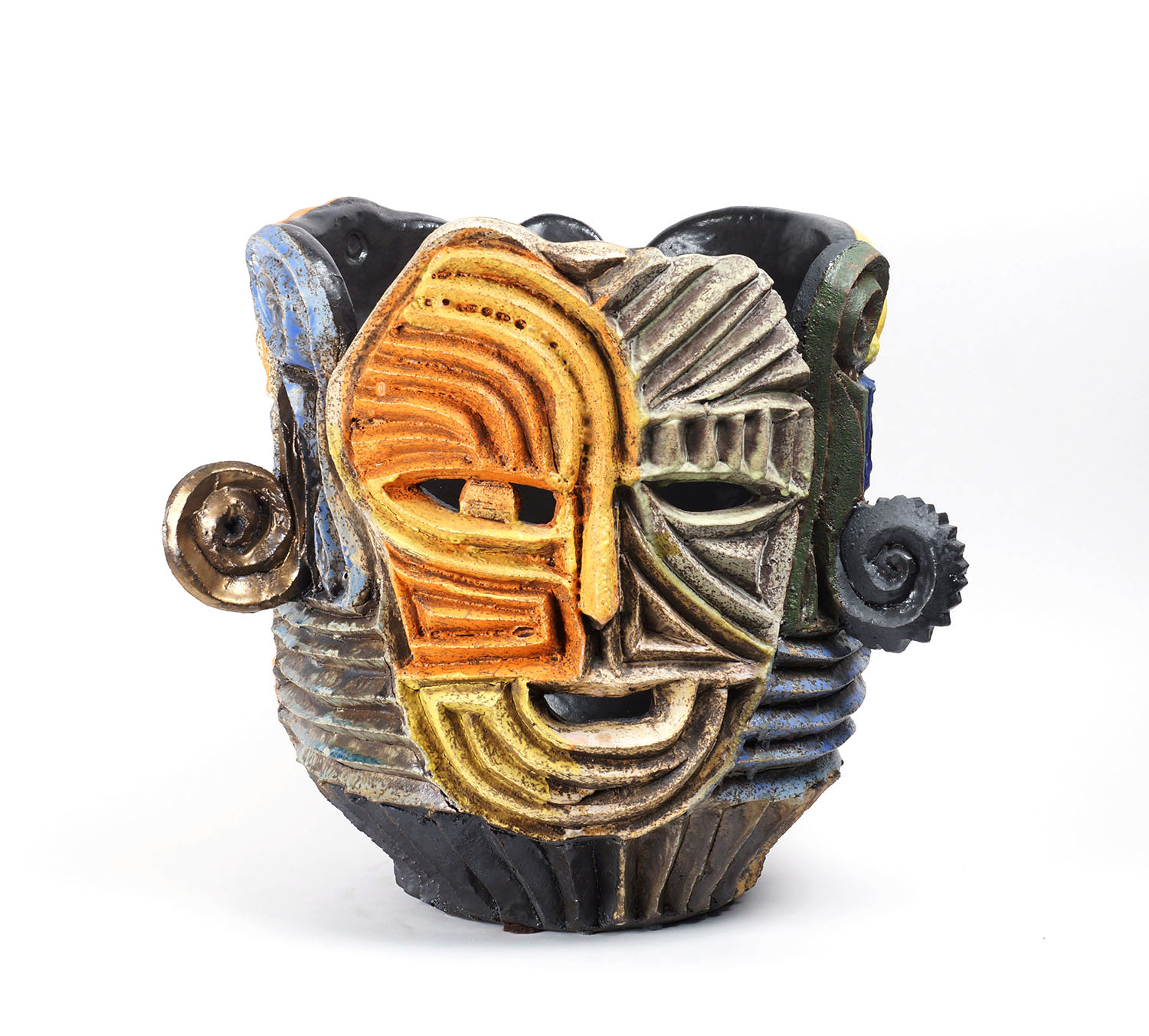Christopher Maschinot creates symbolic ceramic vessels and furnishings from representational forms. Leaves and faces comingle with bold geometric patterns sculpted in high relief. The artist’s deeply textured surfaces create rich patterns emphasized with bold use of color. The artist draws from personal experiences to generate imagery with achetypical narratives and broad cultural motifs such as love, social bonds, and celebration of nature. With each new series Christopher’ builds his expanding lexicon of symbolic imagery and his cast of characters.
