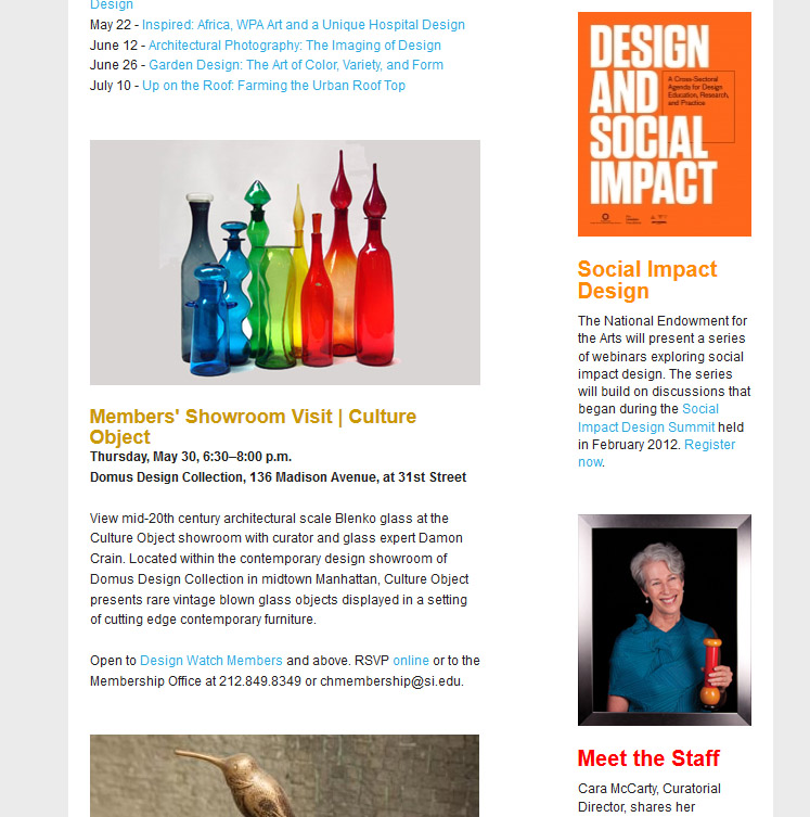 BIG COLOR examines the Architectural Scale blown glass vessels introduced by Wayne Husted in 1954 and produced by the Blenko Glass Company of West Virginia. The unprecedented exhibition included over 120 examples of these massive jewel toned glass objects, the largest collection ever assembled. Architectural pieces are up to 46 inches (117 cm) tall; created to be of a scale substantial enough to engage with the architectural environment and elements like columns and stairs directly, unmediated by furniture. An artist at heart and in training, the defining drive of Husted's tenure as resident designer for Blenko was his desire to create objects that could only be seen as works of art. By altering scale to an extreme and unprecedented degree he struck on an enduring and compelling new genre that suited the modern era, one that unequivocally demands to be considered as sculpture. Hardcover, cloth bound exhibition catalog explores the topic in depth, details & purchasing at this link. Press Coverage: |